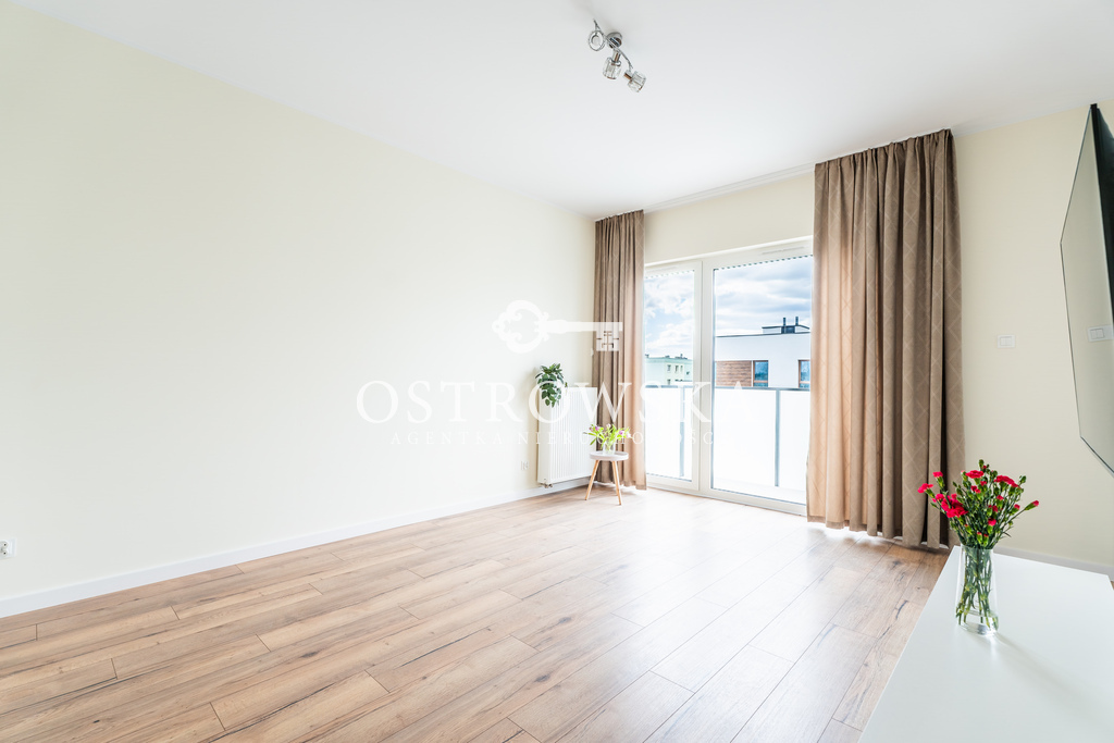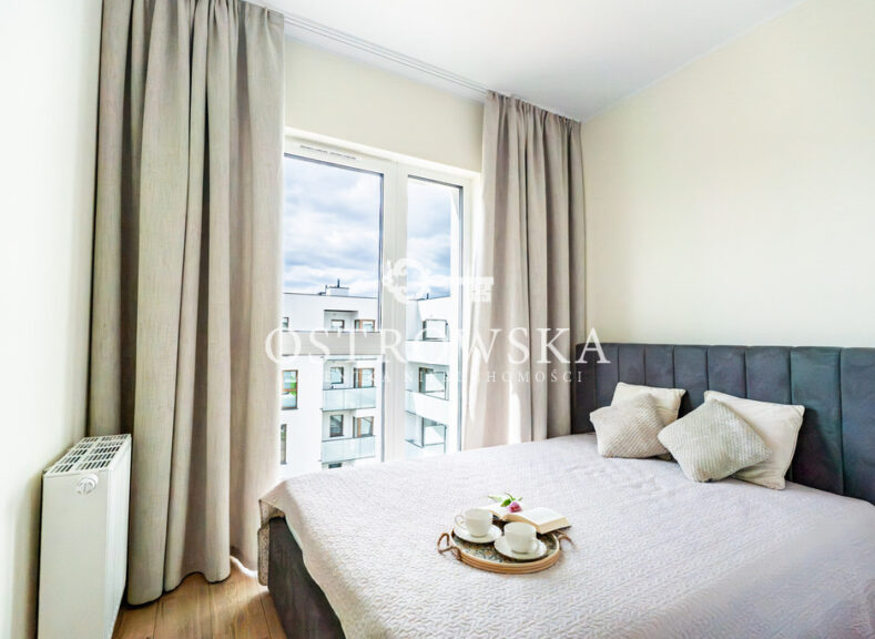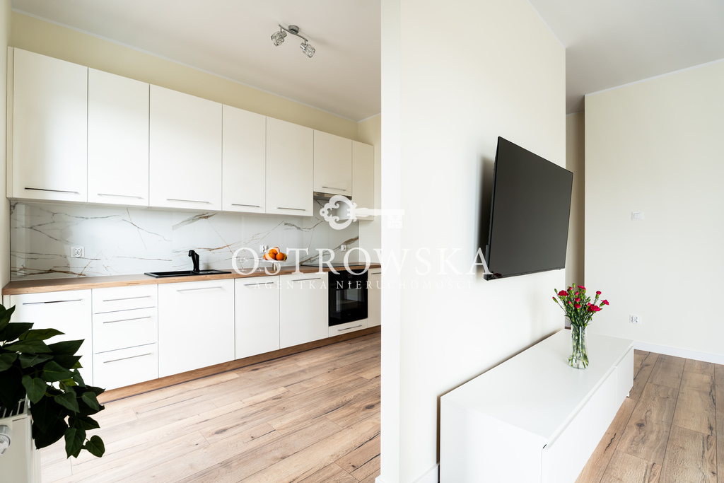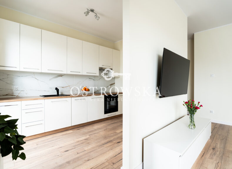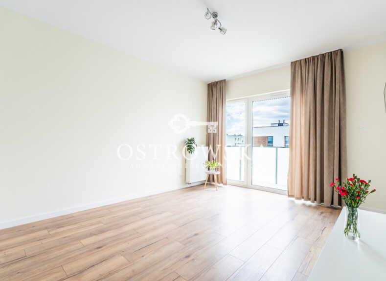 Lokal mieszkalny składa się z kuchni i salonu oddzielonych ścianką, sypialni, łazienki z wc oraz korytarza. Mieszkanie jest jednostronne, okna wychodzą zachód. Mieszkanie jest wykończone, nigdy nie było zamieszkane. Kuchnia została umeblowana, zawiera sprzęt AGD (płytę indukcyjną, okap, piekarnik, zmywarkę). Łazienka wyposażona jest w wc, umywalkę, wannę oraz nową pralkę. W przedpokoju oraz w sypialni znajdują się szafy w zabudowie. Mieszkanie jest słoneczne i gustownie urządzone. Do mieszkania przylega duży balkon.
