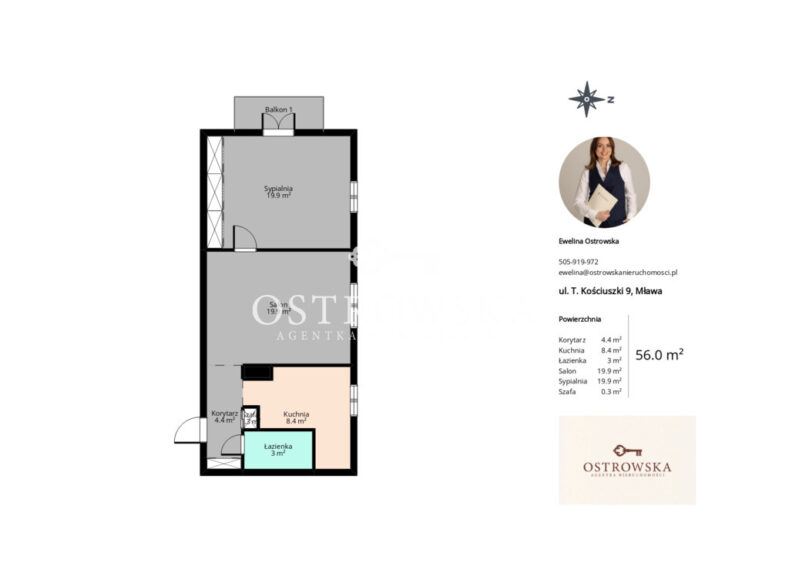 Przedstawiamy na sprzedaż 2-pokojowe mieszkanie o powierzchni 56,05 m² położone przy ul. Kościuszki w Mławie, które znajduje się w przedwojennej kamienicy wybudowanej w 1935 roku. Do lokalu przynależy również garaż o pow. 20 m2 z kanałem, znajdujący się w budynku gospodarczym stojącym obok kamienicy. Forma własności mieszkania to odrębna własność z założoną księgą wieczystą. Brak w niej obciążeń lub służebności – stan prawny jest w pełni uregulowany. Lokal znajduje się na 1. piętrze w dwukondygnacyjnej kamienicy położonej w samym centrum miasta.